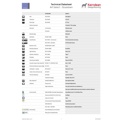 Technical Data Sheet for Karndean luxury vinyl wood plank and stone tile effect Art Select LVT flooring.