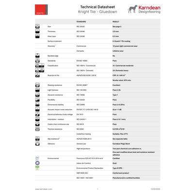 Technical Data Sheet for Karndean luxury vinyl wood plank and stone tile effect Knight Tile gluedown LVT flooring.