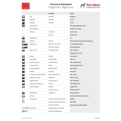 Technical Data Sheet for Karndean luxury vinyl wood plank and stone tile effect Knight Tile rigid core LVT flooring.