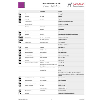 Technical Data Sheet for Karndean luxury vinyl wood plank and stone tile effect Korlok rigid core LVT flooring.