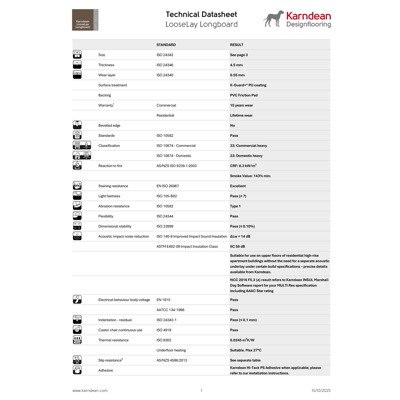Technical Data Sheet for Karndean luxury vinyl wood plank and stone tile effect LooseLay Longboard LVT flooring.