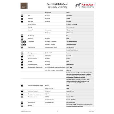 Technical Data Sheet for Karndean luxury vinyl wood plank and stone tile effect LooseLay Originals LVT flooring.