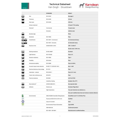 Technical Data Sheet for Karndean luxury vinyl wood plank and stone tile effect Van Gogh gluedown LVT flooring.