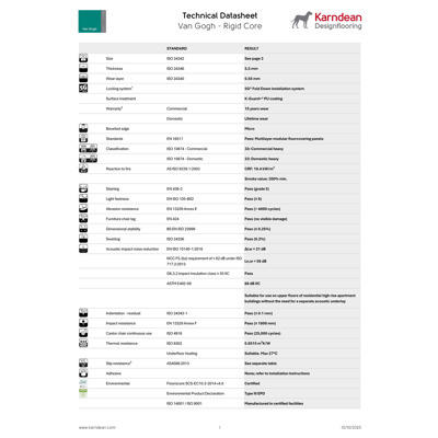Technical Data Sheet for Karndean luxury vinyl wood plank and stone tile effect Van Gogh rigid core LVT flooring.